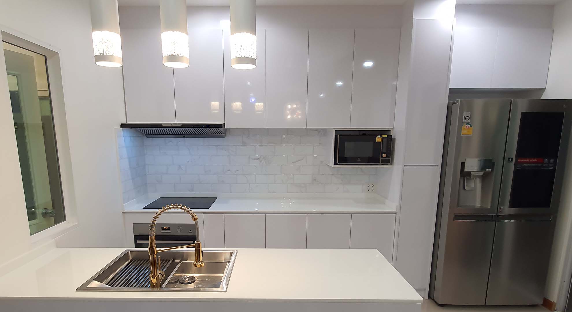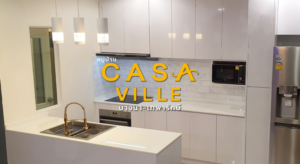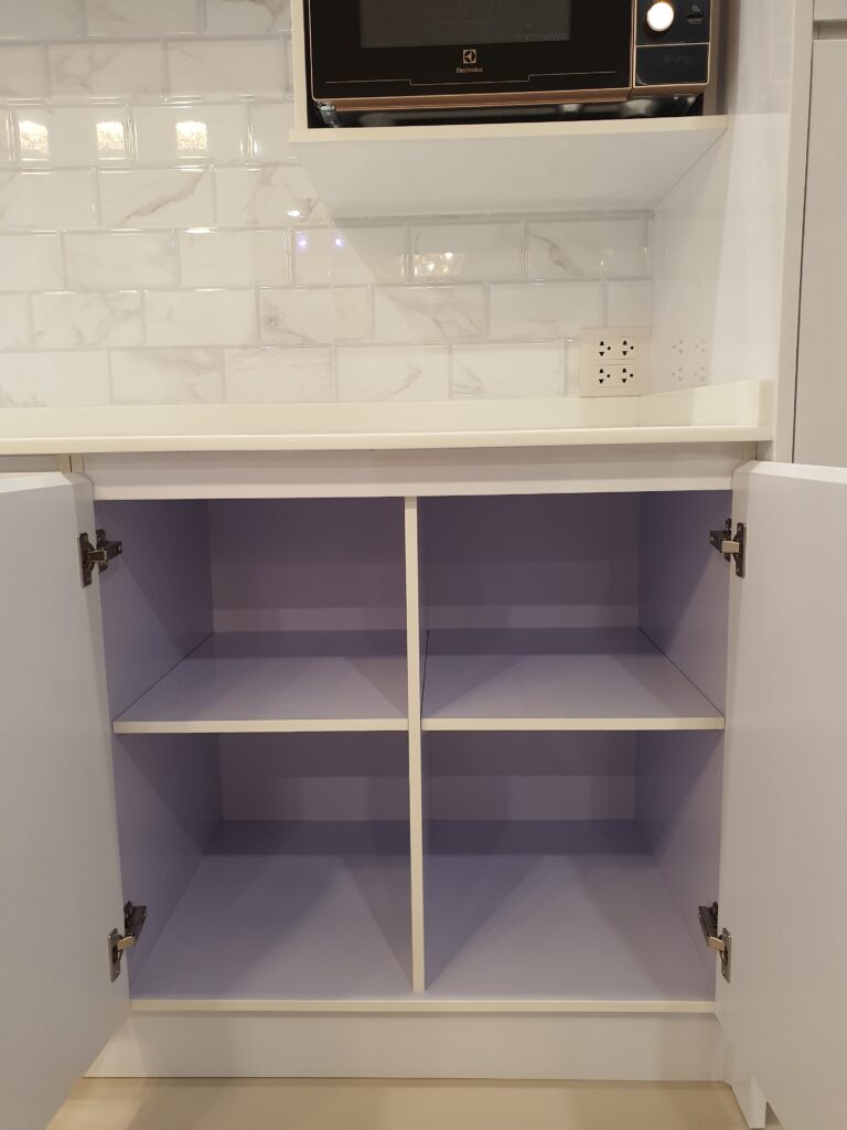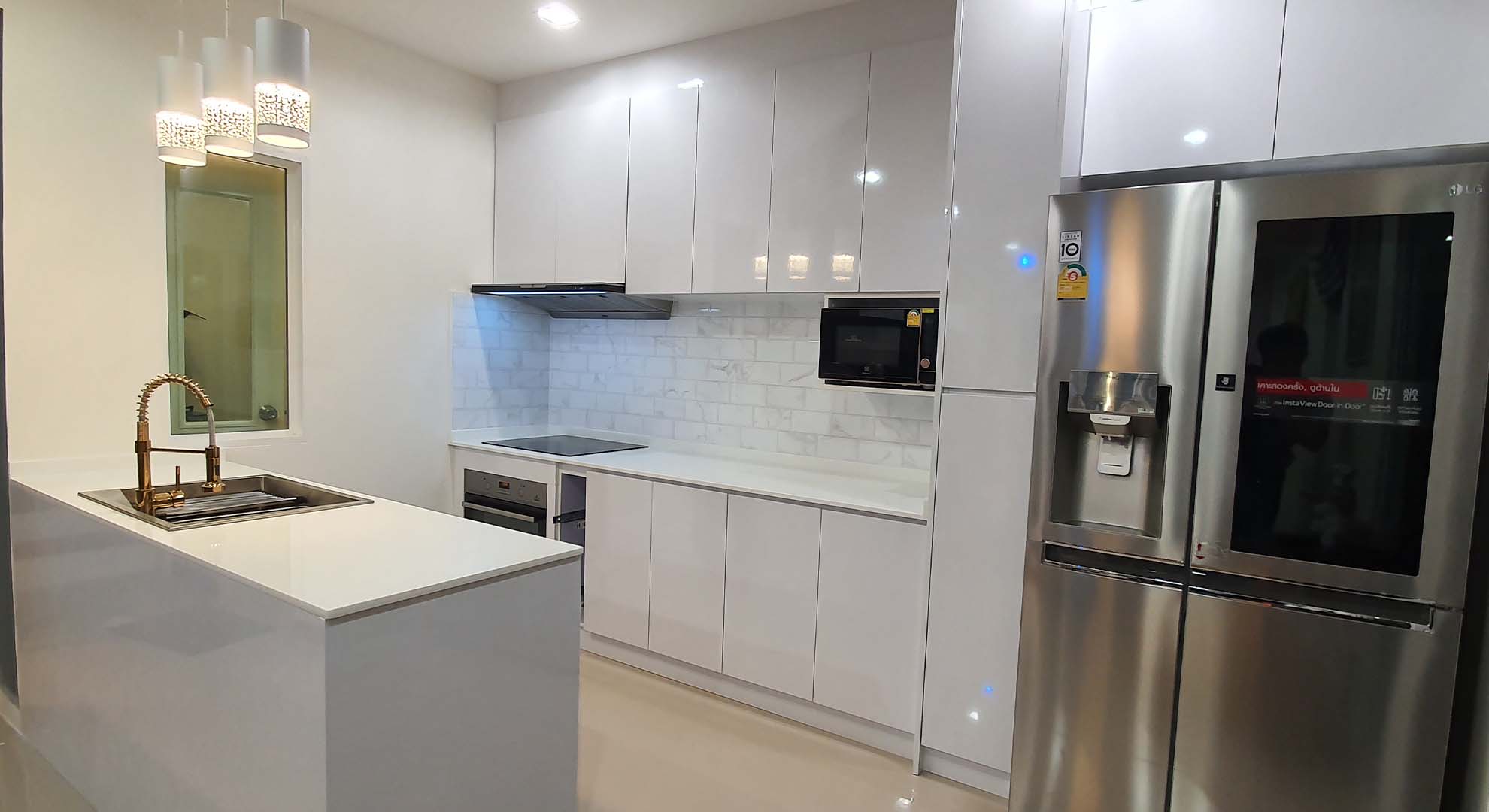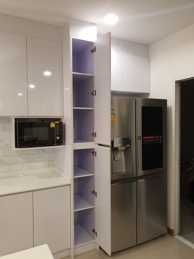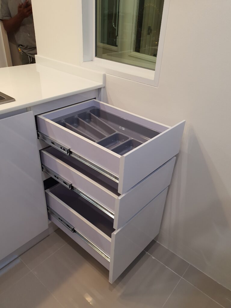 ลิ้นชัก 3 ชุด ลิ้นชักวางขวด หน้าบานเเบบเพ่ ช่องวางไมโครเวฟ ท็อปหินสังเคราะห์สีขาวคริสตัลไวท์ ราวเเขวนผ้าใต้ตู้ ถังขยะในตู้ รีวิวบิ้วอินครัวกันน้ำกันปลวก 100% ครัวหมู่บ้านคาซ่าวิลล์ Smile Kitchen (EP56)