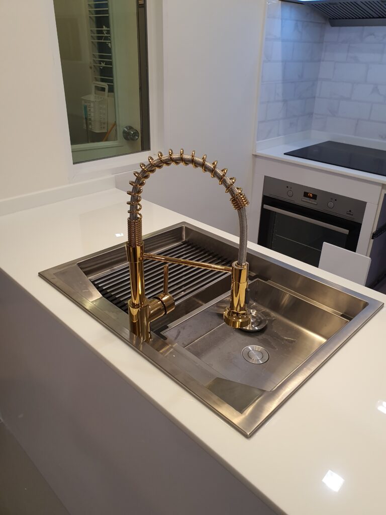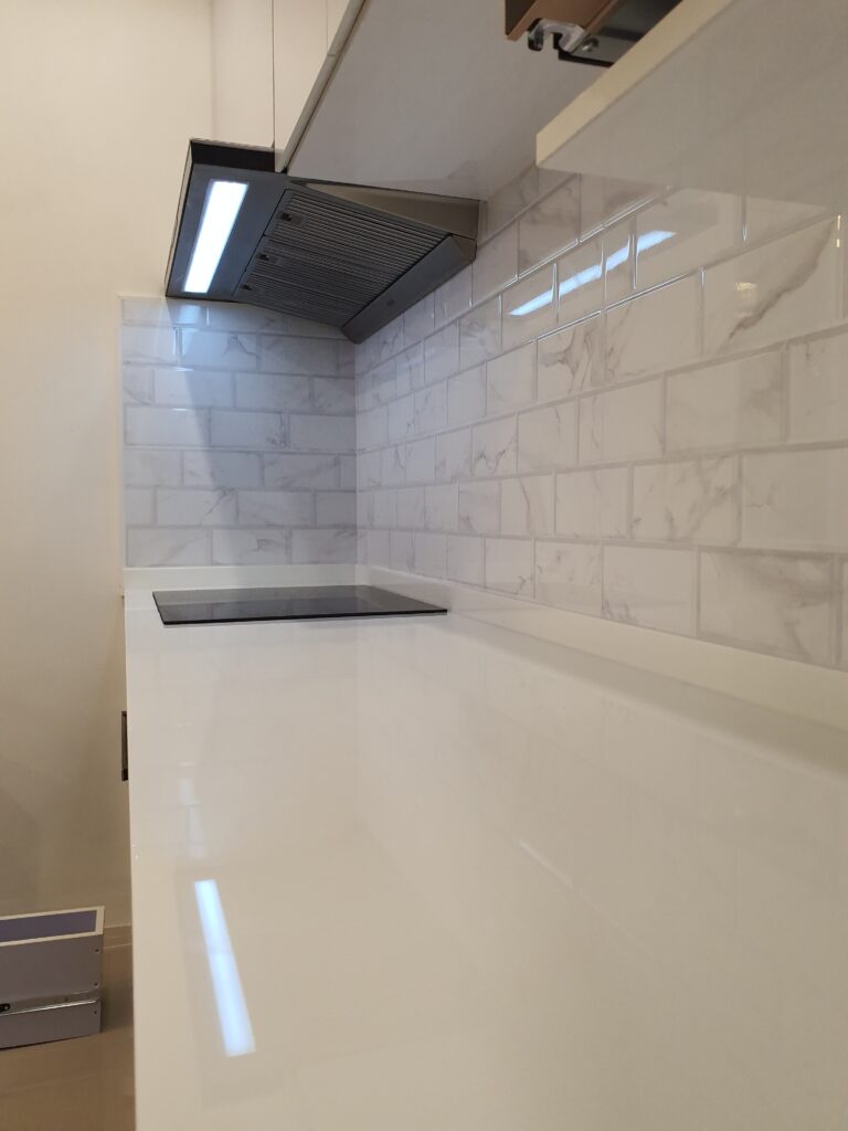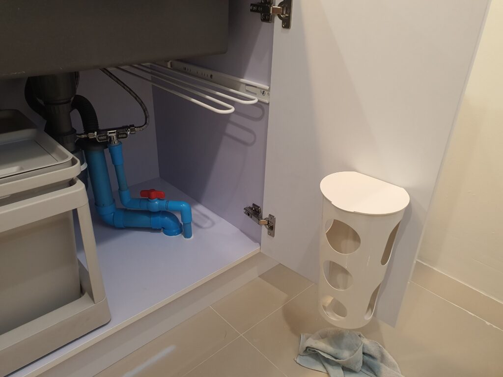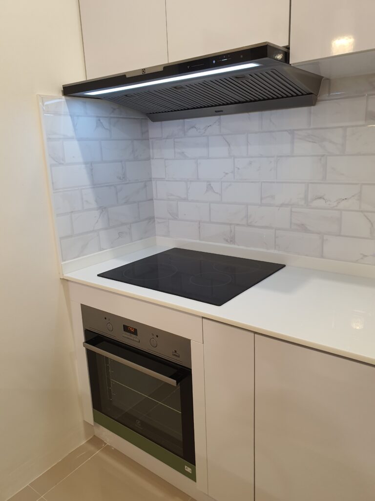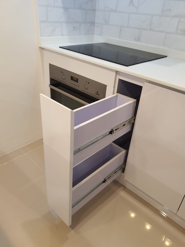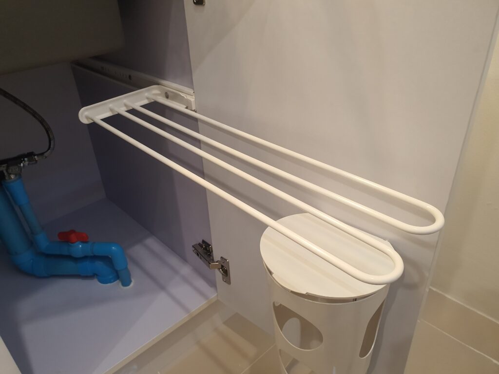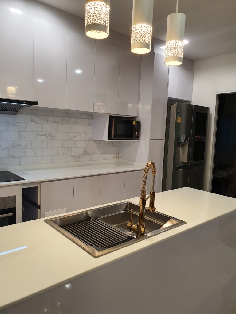 ลิ้นชัก 3 ชุด ลิ้นชักวางขวด หน้าบานเเบบเพ่ ช่องวางไมโครเวฟ ท็อปหินสังเคราะห์สีขาวคริสตัลไวท์ ราวเเขวนผ้าใต้ตู้ ถังขยะในตู้ รีวิวบิ้วอินครัวกันน้ำกันปลวก 100% ครัวหมู่บ้านคาซ่าวิลล์ Smile Kitchen (EP56)